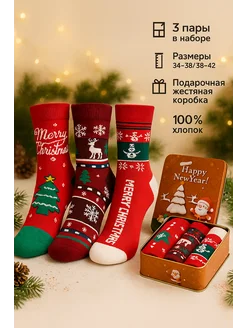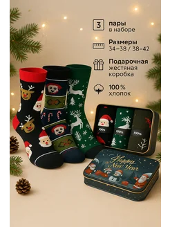 Новогодние носки в жестяной подарочной коробке (3 пары)