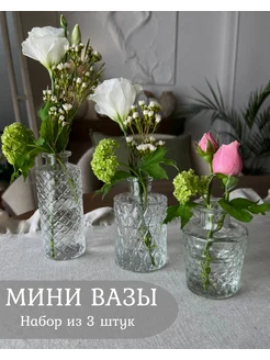 Мини ваза для цветов стеклянная прозрачная, набор 3 шт