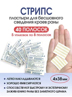Пластыри для стягивания ран Стрипс 4х38 мм 5 уп по 8 штук
