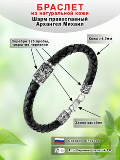 Браслет кожа 4,5 мм оберег шарм Архангел Михаил серебро