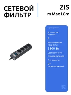 Сетевой фильтр ZIS m Max 1.8m 4 розетки 3300 Вт
