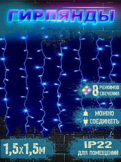Гирлянда занавес штора 1,5х1,5 синяя, с удлинителем,елка