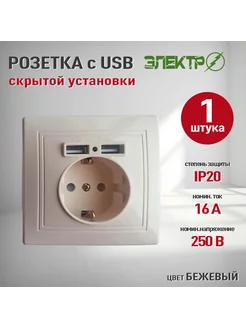 Розетка c USB внутренняя одинарная с заземлением