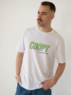 Футболка удлиненная оверсайз базовая белая с принтом Спорт