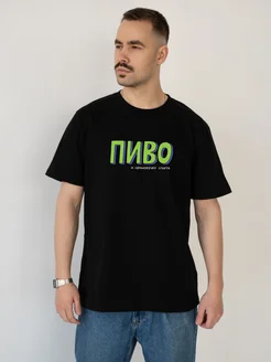 Футболка оверсайз базовая черная с принтом надписью пиво