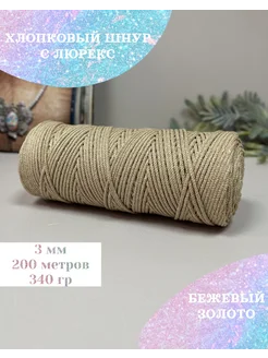 Хлопковый шнур 3 мм 200 м с люрекс "Золото" - Бежевый
