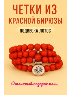 Чётки-мала из красной бирюзы, 108 бусин, с подвеской ЛОТОС
