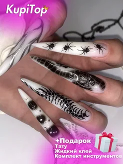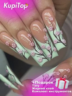 Накладные ногти с дизайном и клеем длинные