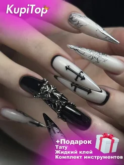 Накладные ногти с дизайном и клеем длинные с крестами эмо