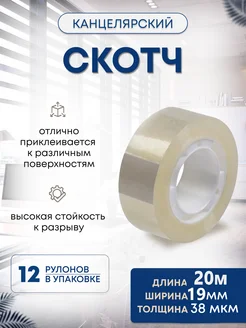 Скотч канцелярский узкий для офиса 19х20 м 12 шт