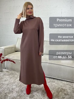Платье трикотажное прямое миди с разрезами и высоким горлом