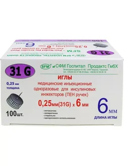 Иглы для инсулиновых инжекторов 31g 0,25х6мм sfm 100 шт-1 уп