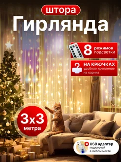 Гирлянда штора занавес 3х3 с пультом и крючками