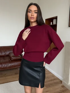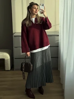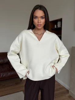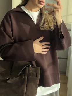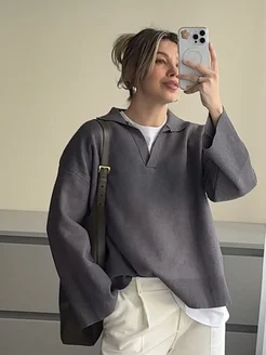 Свитер вязаный с воротником поло удлиненный оверсайз