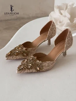Туфли лодочки на каблуке вечерние с брошью бежевые