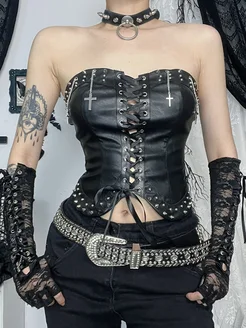 Топ готический черный кожаный с шнуровкой