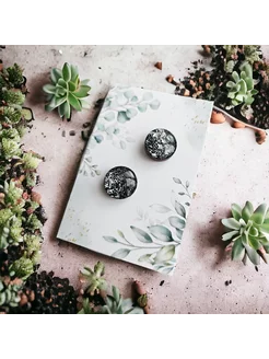 Серьги круглые гвоздики черные с блестками