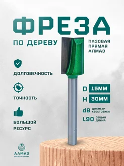 Фреза по дереву, пазовая прямая Алмаз 1007 D15 H30 L90 d8