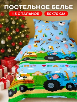 Детское постельное белье 1.5 спальное 50х70 Синий трактор