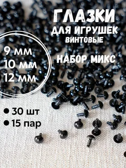 Глазки для игрушек набор 9, 10, 12 мм, 30 шт винтовые