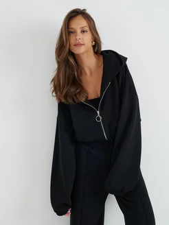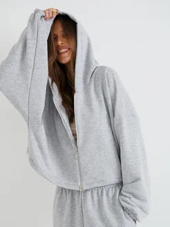 Укороченное худи на молнии оверсайз с капюшоном без начеса