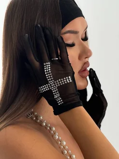Перчатки в сетку прозрачные короткие со стразами