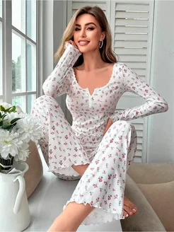 Пижама со штанами и верхом домашняя с кружевами, хлопок