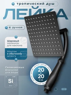Лейка для душа квадратная, тропический душ 20см, черный