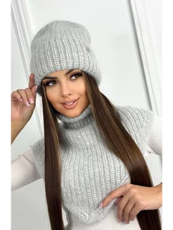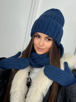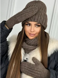 Шапка крупная вязка варежки и хомут комплект 3 в 1
