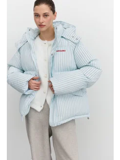 Куртка зимняя пуховик голубая в полоску оверсайз с капюшоном