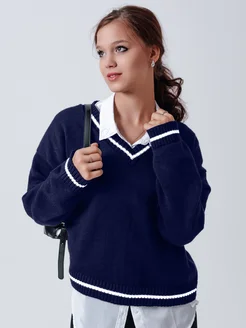 Джемпер оверсайз вязаный свитер с вырезом в школу