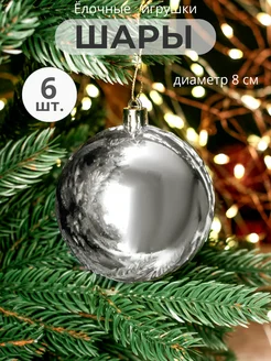 Набор шаров 8 см, пластик, серебряный, глянцевый, 6 шт