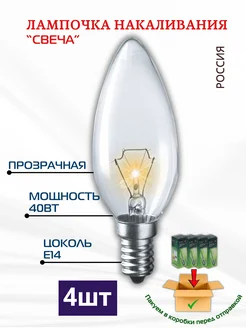Лампочка Е14 свеча 40Вт, прозрачная, 4шт