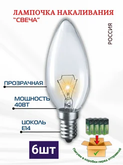 Лампочка Е14 свеча 40Вт, прозрачная, 6шт