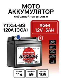 Аккумулятор для мотоцикла AGM 12В 5Ач СТ1205, YTX5L-BS