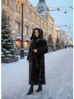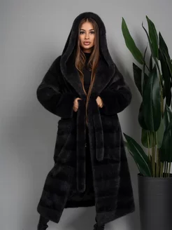 Шуба удлиненная с капюшоном и натуральным мехом