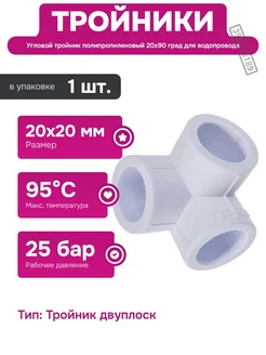 Угловой полипропиленовый тройник 20х20x90 градусов для труб
