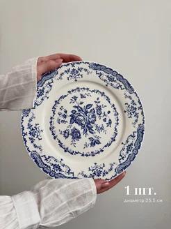 Плоская тарелка с винтажным цветочным узором синяя 25,5 см