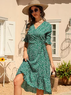 Платье женское летнее в цветочек миди зеленое