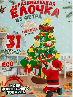 Елка из фетра на стену новогодняя с игрушками и гирляндой