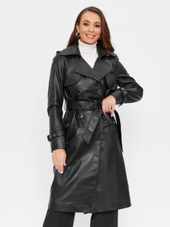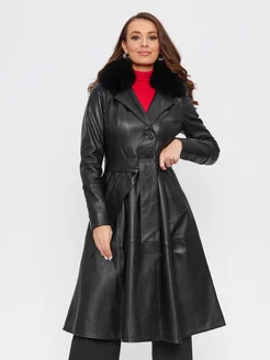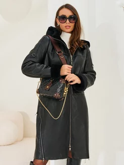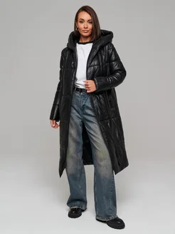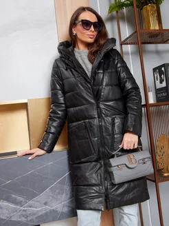 Пуховик-пальто из натуральной кожи с капюшоном длинный