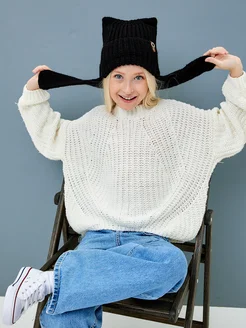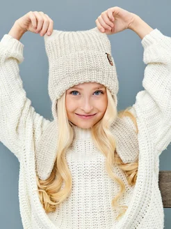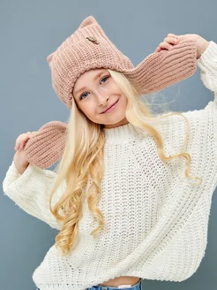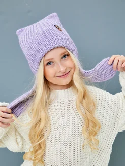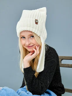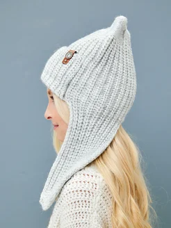 Вязаная шапка ушанка с флисом теплая зимняя с ушками