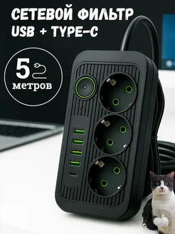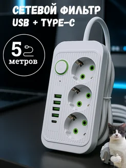 Удлинитель сетевой фильтр с USB + Type-C 5 метров 3 розетки