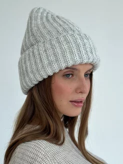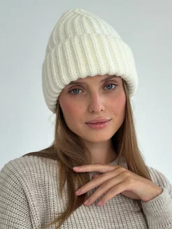 шапка зимняя вязаная бини на флисе с отворотом