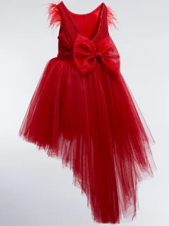Нарядное красное платье с блестками и шлейфом