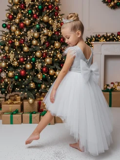 Нарядное белое платье с блестками и шлейфом