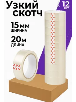 Скотч узкий прозрачный 15мм, 12 шт