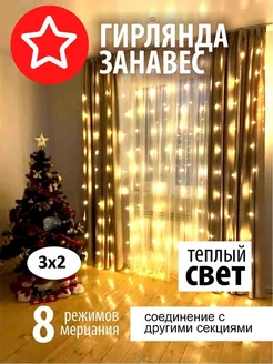 Новогодняя штора-гирлянда занавес теплый свет 3х2м