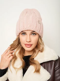 Шапка зимняя вязаная объемная с отворотом на флисе бини