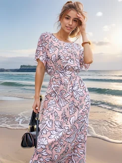 Платье летнее длинное с поясом в цветочек